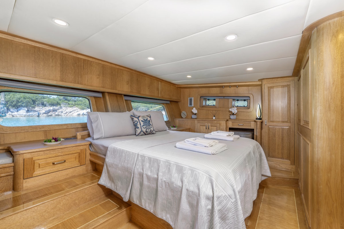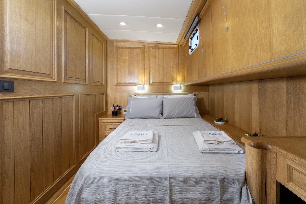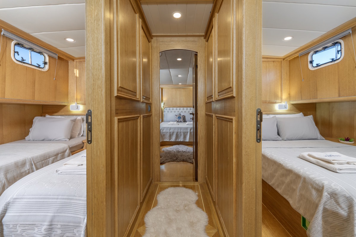 - 4 cabines (2 cabines master avec lits doubles, 1 cabine avec lit double et 1 cabine avec deux lits separes).